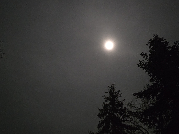 The image depicts a nighttime landscape in Byala Slatina, Bulgaria. A bright, circular full moon is centrally positioned in the upper half of the frame, emitting a strong, diffused white light through a dark grey, likely hazy or overcast sky. Silhouettes of multiple trees are prominent against the illuminated sky. On the right side, two large conifer trees with dense, dark foliage extend upwards from the bottom right corner, partially obscuring the sky. A smaller conifer is visible in the lower-central left quadrant. Bare, deciduous tree branches are also discernible in silhouette, specifically in the lower-right area, situated between the larger conifers. No people, artificial structures, or active interactions are present in the scene.