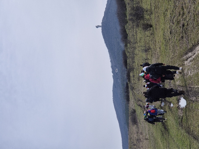Approximately fifteen to twenty individuals, primarily adults, are observed from behind, walking in a loose formation along a muddy dirt path under an overcast sky in the vicinity of Chargan, Bulgaria. The path, characterized by ruts and several standing water puddles, traverses a landscape of sparse, dry grass and scattered low bushes. The individuals are dressed in varied outdoor apparel, including hooded jackets and long pants; some carry backpacks. One person near the center-left holds a Bulgarian flag displaying white, green, and red stripes. In the mid-ground, a forested hill rises, with what appears to be a building structure visible on its lower slope. In the far background, atop a prominent, treed hill, a large, distinct monument, identifiable as the "Defenders of Stara Zagora" memorial complex, stands silhouetted against the pale grey sky.