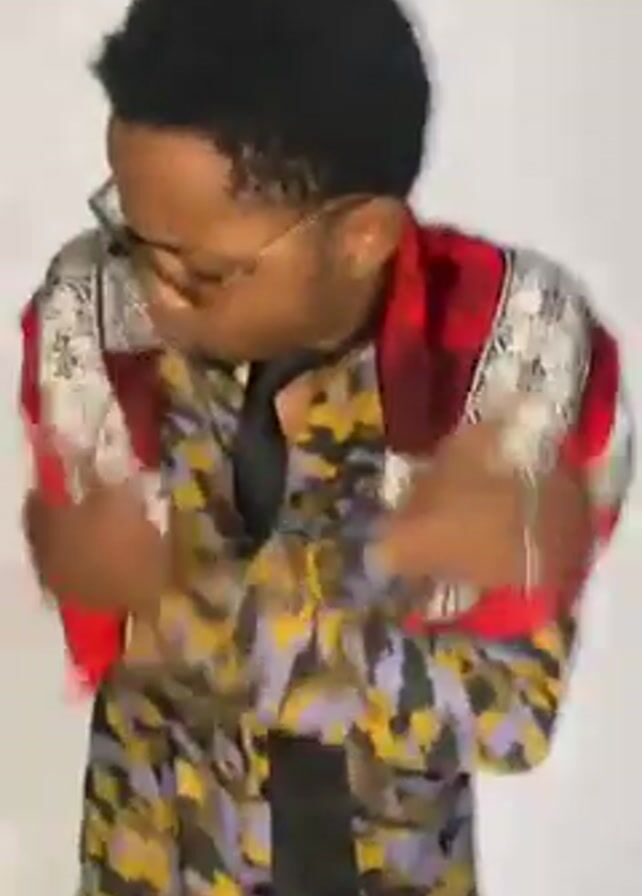 A man wearing sunglasses, a camo print shirt, a black tie, and a red and white scarf is dancing in front of a white background. He crosses his arms and moves to the music.