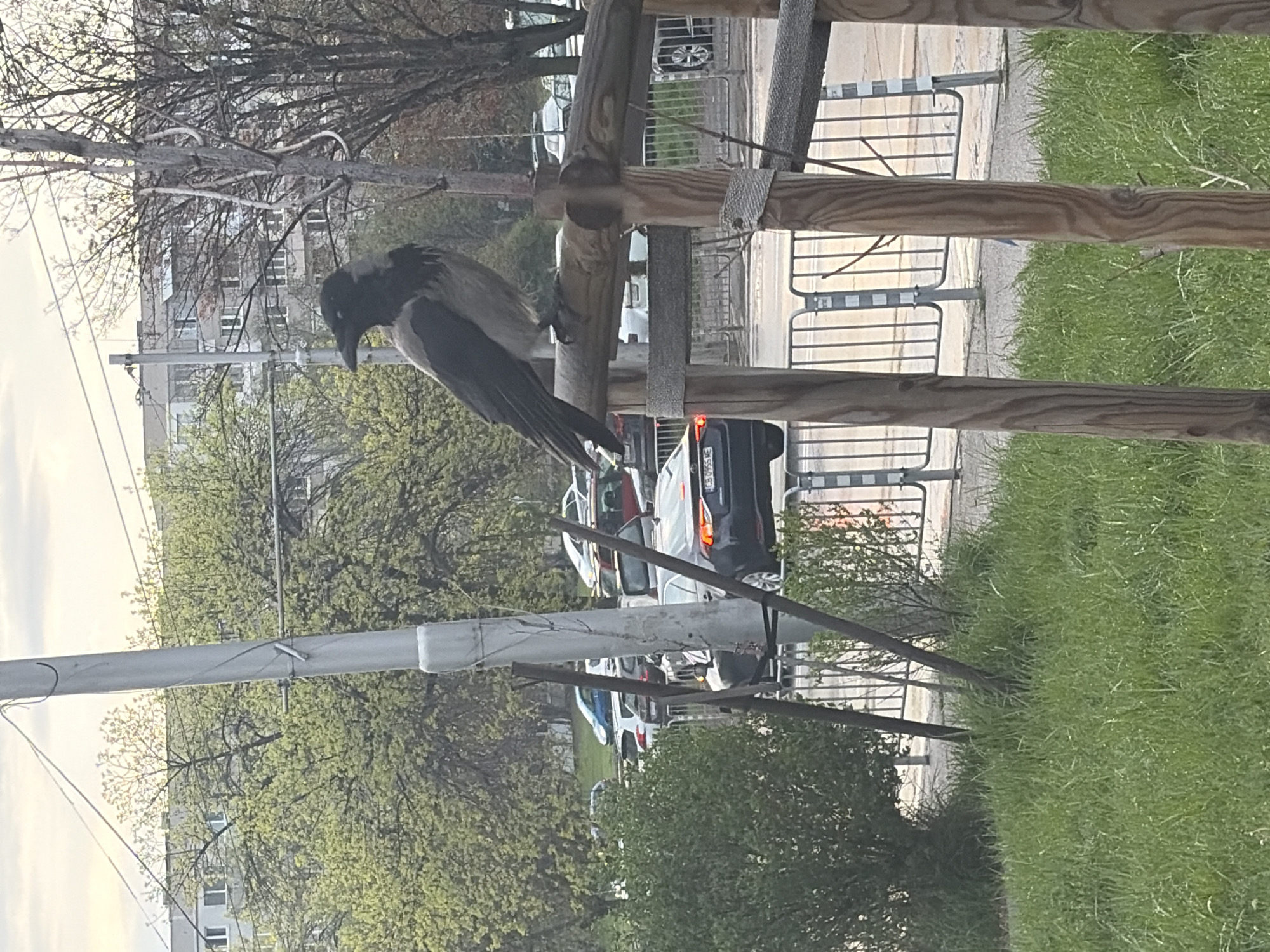 A crow perches on a wooden structure near a street in Sofia, Bulgaria. The crow is primarily gray with a darker head and tail. The wooden structure, made of horizontal and vertical beams, appears to be part of a pedestrian barrier along the sidewalk. In the background, there are cars on the street, buildings, trees, and patches of grass, indicative of an urban setting during daylight.