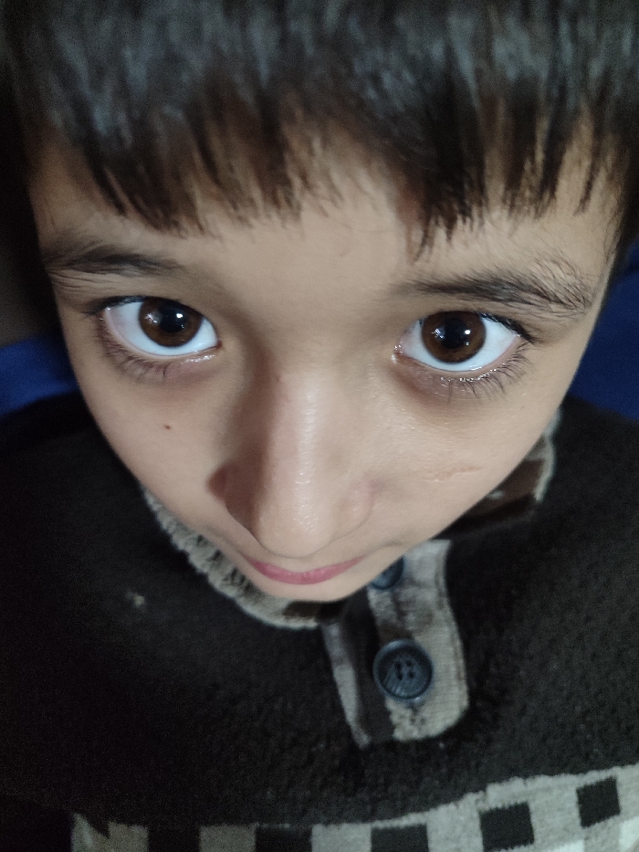 A close-up, high-angle portrait features a young individual located in Rishtan, Uzbekistan. The subject looks directly upward into the camera. Observable characteristics include dark, straight hair with bangs, prominent brown eyes exhibiting visible tear lines and dilated pupils, and natural eyelashes. A small, dark nevus is present on the upper left cheek, and a faint linear scar is visible on the upper right cheek. The subject wears a dark brown or black knitted sweater, detailed with a light brown/beige button placket secured by two dark buttons. A repeating pattern of light and dark squares is discernible on the lower section of the garment. The background is dark and indistinct.