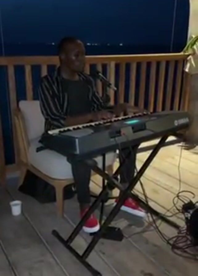 A medium shot depicts a man sitting on a cushioned chair playing a Yamaha keyboard and singing into a microphone on a wooden deck with a railing. The man has short hair and wears a black shirt, a horizontally striped jacket, black pants, and red sneakers. He is focused on playing the keyboard, which sits on a black stand. A small white cup is on the floor to his left. Wires connect the keyboard to unseen equipment to the right. Behind the railing, the dark sea and night sky are visible.