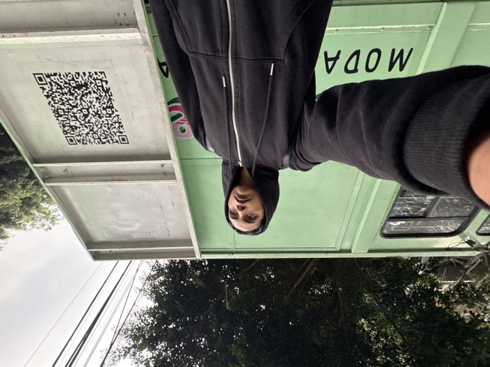 A person wearing a dark hoodie takes a selfie under a light green structure with the word "MODA" printed on it. The structure also has a QR code sticker on its top surface. Trees and power lines are visible in the background. The photograph is taken at a unique angle, as it appears to be an upside-down view of the scene.