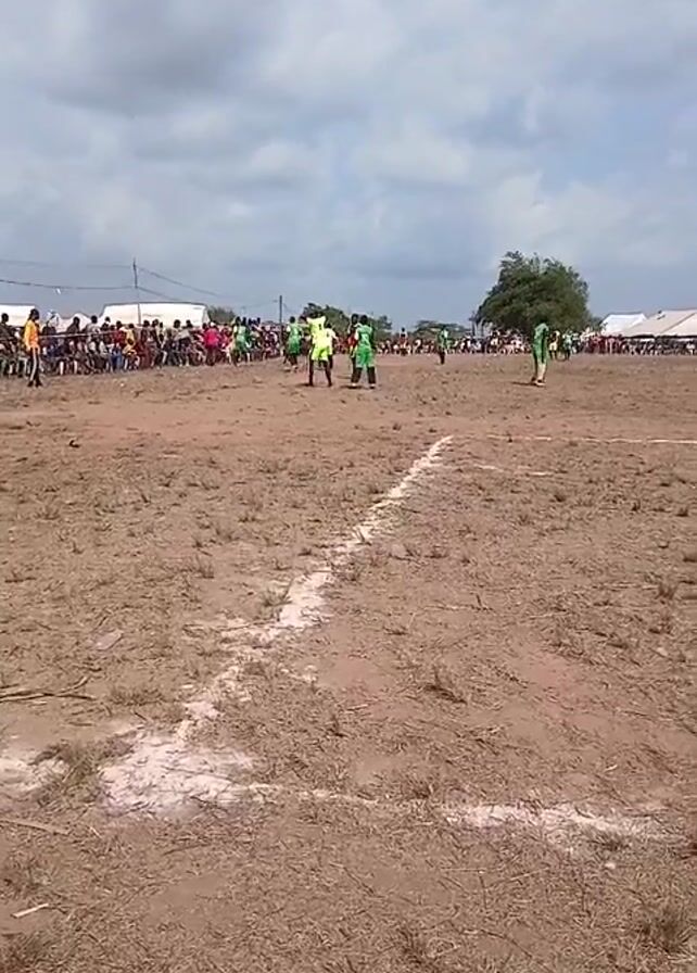 The video depicts an outdoor sports event on a dry, dusty field. A group of people in green athletic wear are visible on the field, seemingly engaged in some kind of sporting activity, while a crowd of spectators watches from the sidelines. A white line marking is visible on the ground in the foreground. A man in a white shirt and black shorts stands near a metal pole structure with a speaker attached. Another person in a black hoodie is standing nearby. Tents and trees are visible in the background under a cloudy sky.