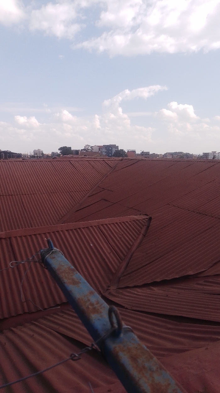 A rooftop view under a cloudy sky shows corrugated iron sheets, rusty in appearance