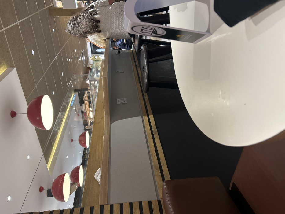 A partial view of a restaurant interior shows a white round table, with a black chair and a table number stand with "175" on it. Part of a woman with curly hair in a white top is visible. The ceiling has a repetitive grid pattern with recessed lights. Red spherical light fixtures hang along the left side. A bakery display case runs parallel to the left wall. There's also a glimpse of a brown leather-like booth seat.