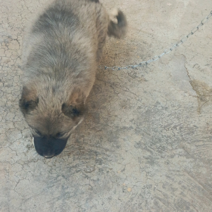 A top-down view captures a brown and gray puppy on a cracked concrete surface. The puppy has a dark muzzle and tail, with a chain leash loosely attached to its collar. The concrete background features visible cracks and a slight discoloration near the upper right of the scene. The focus is sharpest on the puppy, with a shallow depth of field blurring the distant parts of the ground.