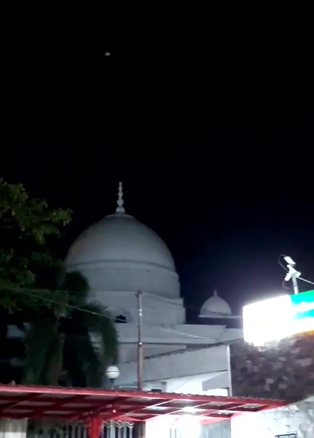 The video begins with a low-angle shot focused on a white domed structure with an ornate spire against a black night sky. A few trees are visible to the left of the dome. The camera then pans to the right, revealing a brightly lit gas station convenience store called "Indomartkopi." A few motor scooters are parked outside, and people are seen inside the store. The video ends with the gas station building as the primary focus against the dark sky.