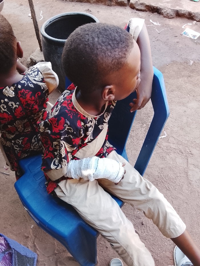 This image depicts an outdoor scene in Wukari, Nigeria. The primary subject is a dark-skinned child, estimated to be between 3 and 7 years old, with short, dark hair, seated on a blue plastic chair. The child is dressed in a black long-sleeved shirt adorned with red and white floral or swirl patterns, featuring light-colored trim on the collar and sleeve cuffs, paired with light brown trousers. A white bandage is wrapped around the child's left forearm and wrist. The child's head is turned towards the right side of the frame, with the right arm resting on the backrest of the blue chair. A second child, partially obscured and similarly dressed, is seated directly behind the primary subject, also on a blue plastic chair. The ground beneath them consists of reddish-brown packed earth, with a dark, cylindrical container visible in the background, alongside scattered light-colored debris. The scene is illuminated by natural light, indicating daytime.