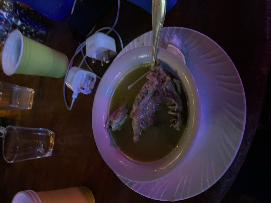 bowl of soup, with a piece of meat and broth in it, sitting on a white plate. It appears to be on a wooden table in a dimly lit room, with other objects in the background, such as a glass, a cup, and a power cord. The soup is a light green in color and the meat appears to be chicken. The image is blurry, with a purple hue, as if taken with a cell phone camera. This is likely the view from a table inside a restaurant or bar, based on the objects in the background. The coordinates provided (latitude: -6.157, longitude: 35.724) indicate a location in Dodoma, Tanzania.