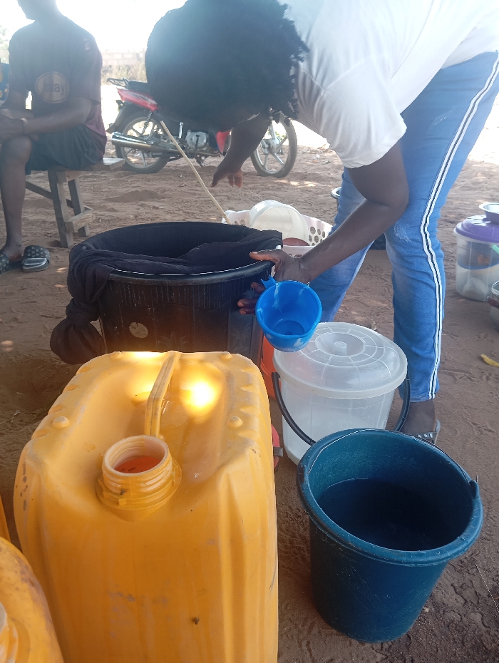 In an outdoor setting in Lafia, Nigeria, a person with dark, curly hair, wearing a white t-shirt and blue jeans with white side stripes, is actively pouring a light-colored liquid from a blue plastic scoop into a large black plastic bucket