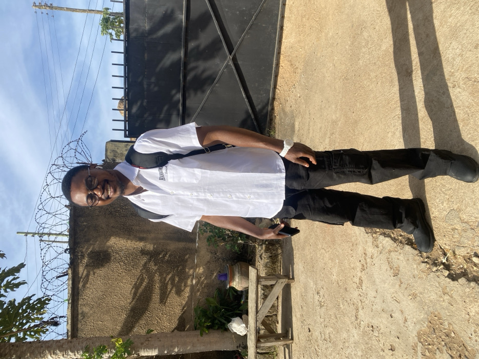 A man smiles at the camera while standing outside on a sunny day. He's wearing a white button-down shirt, black pants, and boots. A black backpack strap is visible on his shoulder. Behind him is a fence topped with barbed wire and a metal gate. The ground is concrete, and long shadows stretch across it. He's holding a cell phone in his hand.