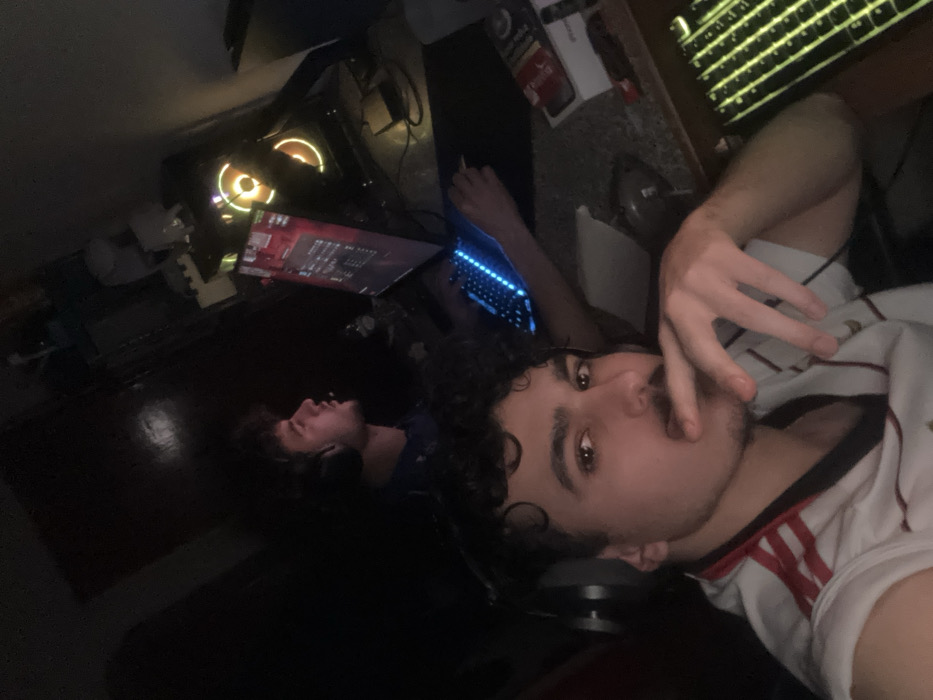 This image depicts two males inside a dimly lit indoor room. The specific location within Bragança, Portugal, is not visually discernible from the image content. In the foreground, a male with dark, curly hair, a mustache, and light facial stubble is looking directly at the camera. He is wearing a white short-sleeved shirt with red stripes on the shoulders and a pair of headphones resting around his neck. His right hand is raised, with the index finger touching his upper lip/mustache area. Behind and to the right of the foreground figure, a second male is seated at a computer desk, focused on a monitor. He has dark, curly hair and is wearing a dark shirt and a headset with a microphone boom positioned near his mouth. His right hand is visible, operating a computer mouse on a dark mousepad. The desk setup includes a desktop computer tower with three illuminated internal fans emitting an orange glow. The monitor displays a dark-themed interface, possibly from a game or application. A keyboard with blue backlighting is visible. Other objects on the desk include a white box, a red and white beverage can (appearing to be Coca-Cola), and a piece of white paper. A second keyboard with yellow-green backlighting is partially visible in the lower right corner of the frame. The room's ambient lighting is low, with electronic displays and backlighting providing the primary light sources.