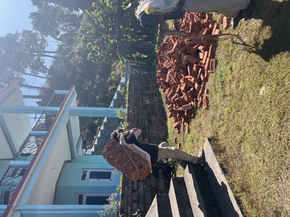 A man carries a large stack of bricks up concrete steps, braced against his back with straps. Another man stands next to a larger pile of bricks on a grassy area. Behind them, a stone wall separates the grass from lower ground. A building with light blue trim is visible on the left, and trees surround the scene.