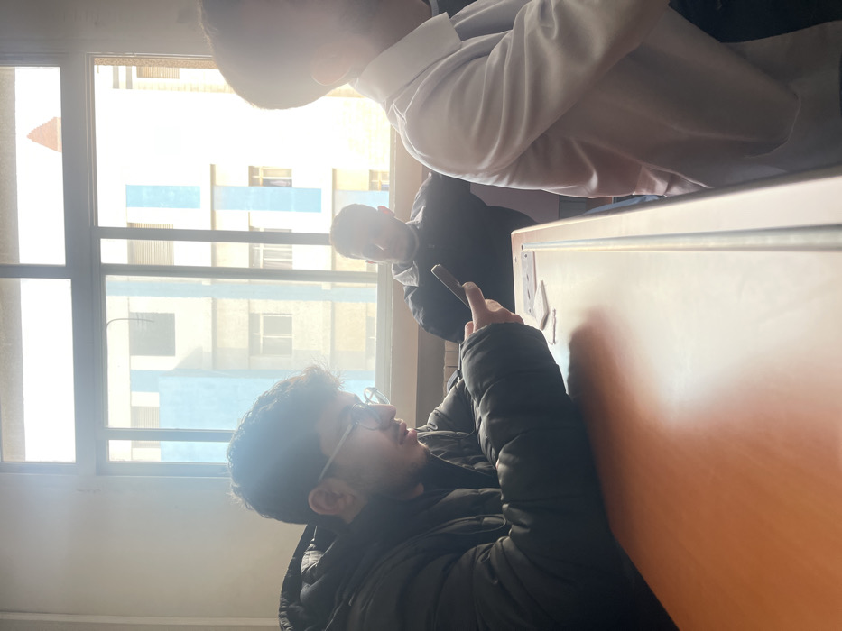 The image portrays an indoor scene, likely a classroom or study area within an educational institution in Homs, Syria. Three young adult males are present. In the foreground left, a male with short dark hair and eyeglasses is seen wearing a dark, possibly black, puffer jacket. He holds a smartphone with both hands and looks down, appearing to interact with the device. On the light brown table in front of him, several small white rectangular cards or papers are visible. Behind him and slightly to his right, another male with short dark hair and a beard is seated. He wears a dark jacket, possibly with a light-colored collar, and his face is partially obscured by glare from an external light source. On the far right of the frame, the torso of a third male is visible, clad in a white long-sleeved shirt. His face is entirely obscured by intense sunlight and glare. A large window spans the background, divided into multiple panes, through which bright natural light enters the room, creating significant glare, particularly on the right side. Beyond the window, several multi-story buildings are visible in an urban setting. One prominent building in the background features a facade with distinctive vertical light blue and white stripes. A white, finned radiator is positioned against the wall below the window on the left side of the scene. The overall environment suggests a brightly lit interior during daylight hours.