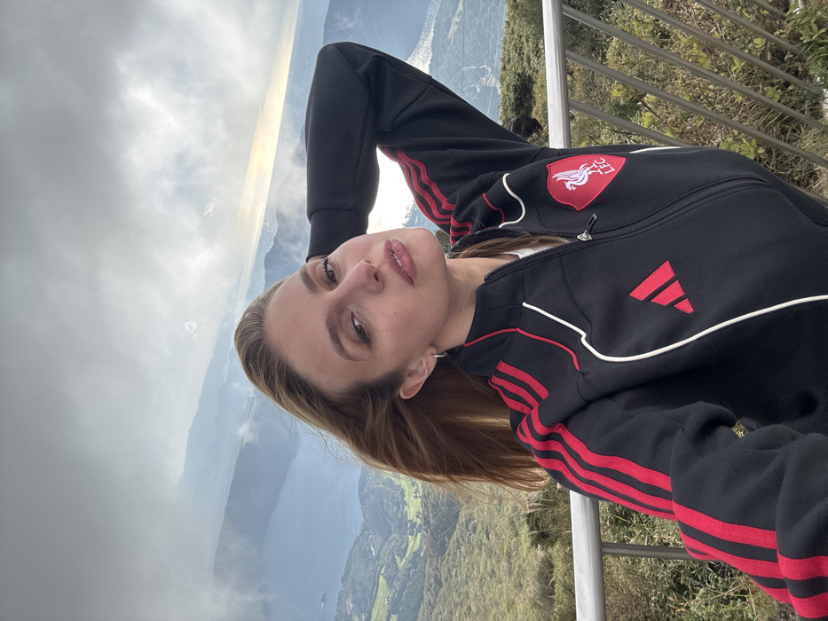 A female subject is depicted in a selfie, positioned at an elevated viewpoint overlooking Lake Ashi (Ashinoko) in Hakone, Japan. She has light brown hair and wears a black zip-up track jacket with red stripes on the sleeves and white piping details. The jacket features a red Adidas logo on the right chest and a red Liverpool FC crest on the left chest. Her right arm is raised, with the hand placed behind her head. She is looking directly at the camera with a slight expression. The background reveals a vast landscape consisting of Lake Ashi, partially shrouded by low-hanging clouds or mist, surrounded by green, tree-covered hills and mountains. A small boat is visible on the lake's surface. The sky above is overcast with gray clouds, though a brighter area is present on the horizon. A metal safety railing runs horizontally across the lower foreground of the image.
