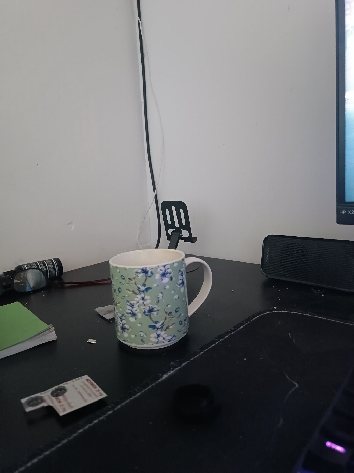 The image depicts a static indoor scene focused on a black desk surface against a white wall. The location is identified as Tbilisi, Georgia, based on a white sticker with Georgian text "მობილური 22 72 72 00" (Mobile 22 72 72 00) positioned on the desk. **Environment:** The background consists of a plain white wall forming a corner, with black and white cables running vertically along the seam. The foreground is dominated by a black desk surface. **Objects:** * A light mint green ceramic mug, patterned with white and blue floral designs, stands centrally on the desk. Its interior appears white. * To the left of the mug are a small green notebook with white pages, a black cylindrical object (possibly a flashlight), and a pair of eyeglasses with dark frames resting on the cylindrical object. * The aforementioned white sticker with Georgian text and a logo is located near the notebook. * A black, slatted, foldable plastic stand, suitable for a phone or tablet, is positioned behind the mug. * To the right of the stand, a black "manab" branded speaker is present. * The far right edge of the frame shows a portion of an "HP X2" computer monitor. * The foreground features a large black mouse pad, visibly covered with lint, and a small black object (possibly a mouse or cable grommet) on its surface. * A segment of a black keyboard with purple backlighting is partially visible on the far right. **People/Actions/Interactions:** No people are present, and no actions or interactions are depicted. The objects are stationary.