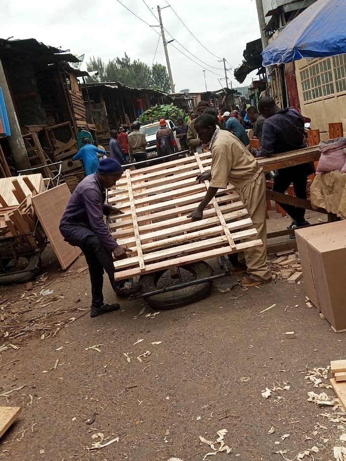 An unpaved thoroughfare in a bustling informal market or industrial area, consistent with Nairobi's Gikomba Market in Kenya, is depicted under an overcast sky. In the foreground, two adult males are cooperatively maneuvering a large, unfinished wooden pallet onto or off a makeshift handcart constructed from a single vehicle tire and metal frame. The man on the left wears a dark blue long-sleeved shirt, dark pants, dark shoes, and a blue knit cap, while the man on the right wears light brown overall-style attire. Numerous other adult males are visible throughout the midground and background, engaged in various unidentifiable activities. One man in a dark hoodie leans over a wooden table on the right. The thoroughfare is flanked by densely packed, rudimentary market stalls or workshops built from corrugated metal and timber, with a blue tarp canopy extending from a structure on the right. A white pickup truck, heavily laden with green produce and displaying a Kenyan license plate, is visible in the mid-background. Overhead power lines and wooden utility poles traverse the scene. The reddish-brown unpaved ground is extensively covered with wood shavings, sawdust, and scattered timber scraps, indicating active carpentry or wood-related commerce.