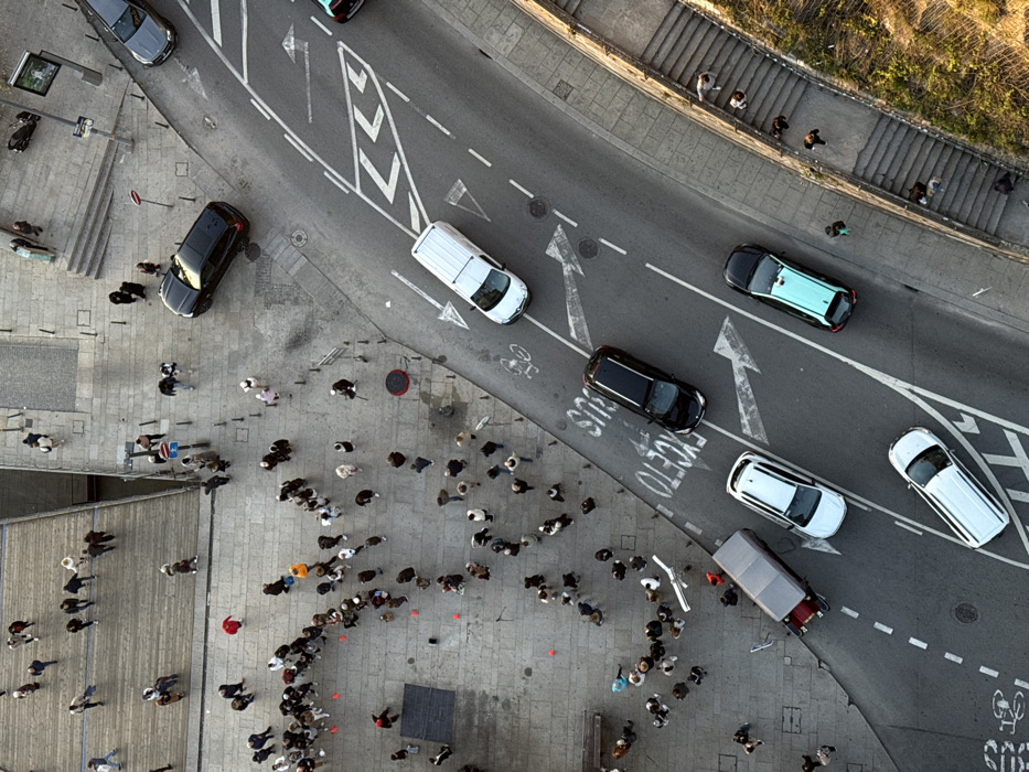 An aerial view depicts a street scene. Several cars, including white, black, and a light blue one, are on the road marked with directional arrows and dashed lines. Pedestrians gather on a paved area adjacent to the road, some forming a queue. A building with stairs is on the left side of the frame, and another set of stairs with people are visible on the upper right. The scene is captured in daylight with shadows cast by the setting sun.