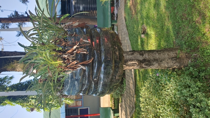 The image displays an outdoor scene in Kisumu, Kenya, under a clear blue sky. A dark, corrugated plastic bottle, repurposed as a hanging planter, is suspended from an unseen structure by thin white ropes in the foreground. It contains numerous green, elongated leafy plants, some with visible dried brown foliage, and several small dark purple or brown blossoms. The planter is positioned directly above a thick, roughly textured tree trunk that rises from the ground. The immediate ground area consists of green grass and low-lying green shrubs. To the left of the central tree, a paved walkway constructed of light-colored interlocking bricks is visible. Beyond the walkway, a building with a light blue-green roof and a dark blue rectangular panel on its side is partially visible. A green park bench is situated in front of this building, and a red vertical pipe or post is also present. Further in the background on the left, a tall, slender tree with dark green foliage stands. To the right of the central elements, another tree trunk is visible, and behind it, a large black plastic water storage tank. No individuals are present in the scene.