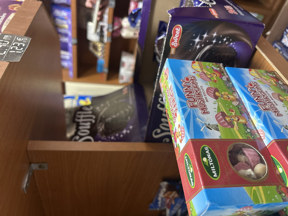 This image presents a detailed view inside a retail establishment, likely a convenience store or small supermarket, situated in Troyan, Bulgaria. The scene is dominated by product displays on wooden shelving. In the immediate foreground, a stack of colorful boxes of "MILTONAS FUNNY MUSHROOMS MINI BISCUITS" rests on a wooden shelf. The top box features vibrant cartoon mushrooms and a transparent cutout displaying actual pink and white mushroom-shaped biscuits. To the right of these, a purple box labeled "Pro Sweet" is partially visible, showcasing a dark, glossy, chocolate-covered product. Behind these items, in the midground, large purple packages branded "Souffle" are displayed on another shelf, with one clearly visible and another slightly obscured. A sturdy wooden vertical support or shelf divider is positioned on the left side of the frame. The background, largely out of focus, reveals additional wooden shelving units filled with various packaged goods, predominantly in purple and blue wrappers. A black price tag, hanging from an upper shelf, displays "£.40 лв." (Bulgarian Lev) and "1.23 €". On the far right side of the frame, a human hand is partially visible, appearing to reach for or manipulate an item on one of the higher shelves. The ambient lighting suggests an indoor commercial setting.