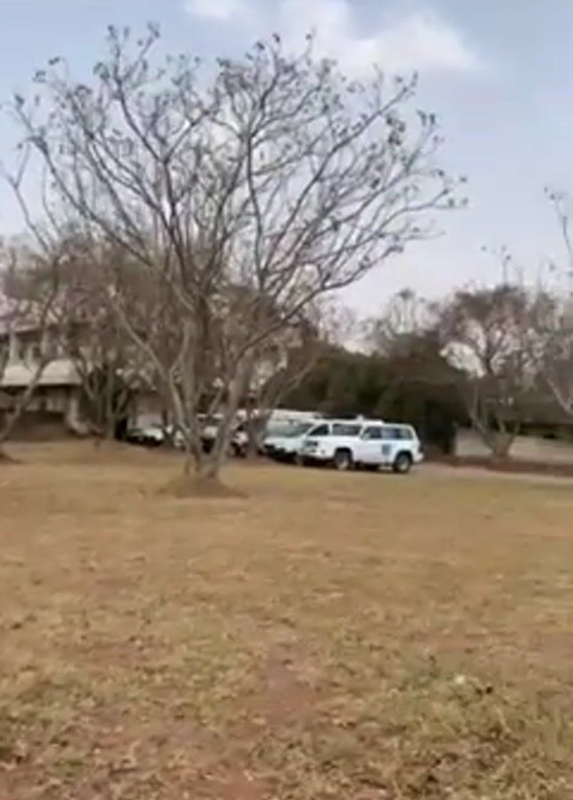 The video begins on a grassy field with a few leafless trees. A light-colored building with multiple windows is visible in the background, along with parked vehicles. The camera pans to the right to show a slender tree with bright green leaves. It continues panning to show a street with a drainage ditch. The street is lined with small, conical trees and lampposts. The sky is light blue with some clouds.