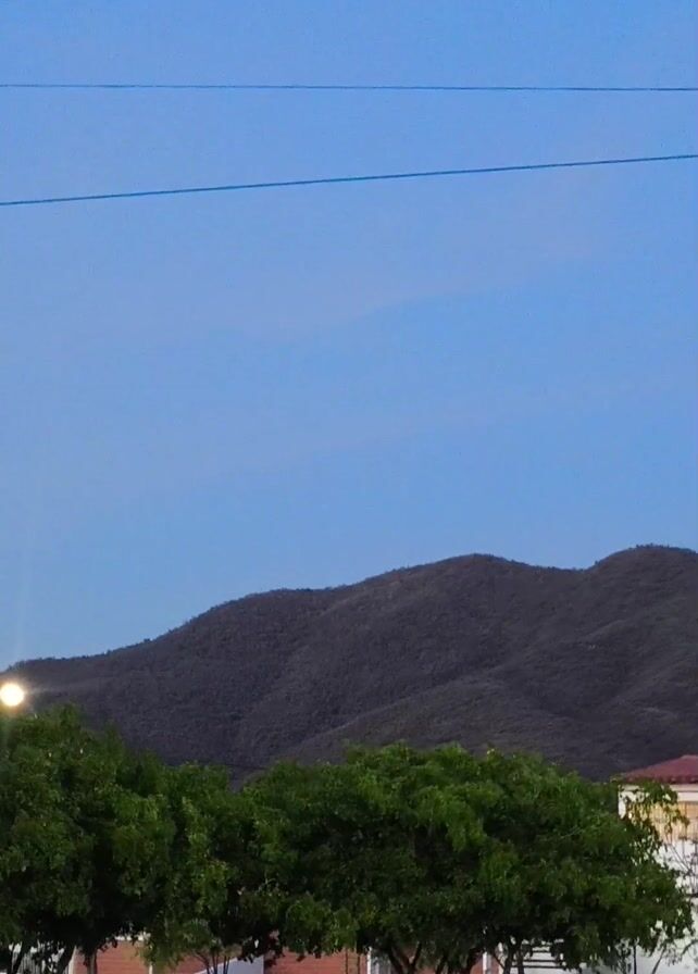 The video presents a static shot of a serene outdoor scene at what appears to be dusk or dawn. The sky is a gradient of light blue. In the foreground, there's a row of green trees with thin trunks. Behind the trees are low buildings, some appearing to be single-story brick structures. A white car is parked in front of one of the buildings. A mountain range looms in the background, its silhouette dark against the bright sky. Power lines stretch across the top of the frame. The overall setting evokes a sense of calm and rural simplicity.