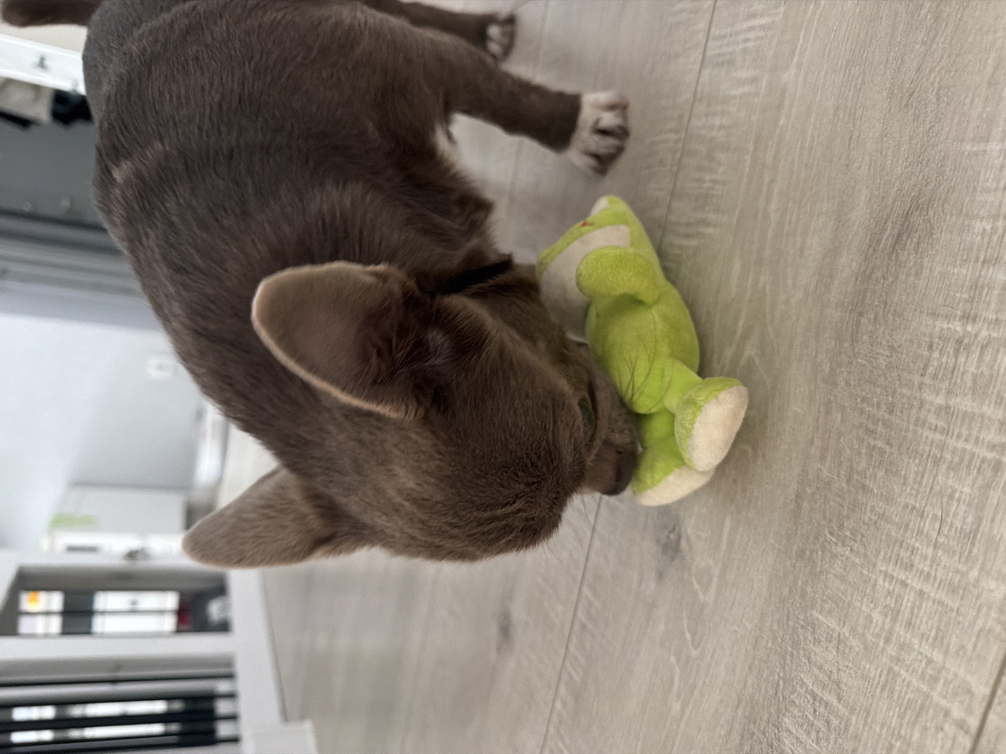 A gray cat is playing with a green stuffed frog on a light-colored wooden floor