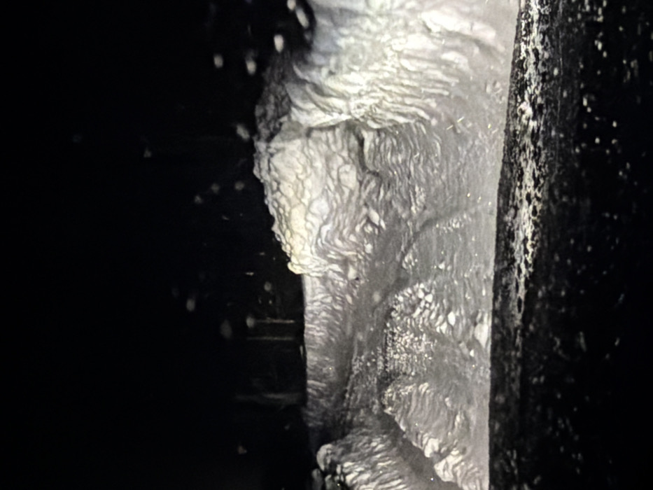 The scene depicts a snow-covered, unpaved road at night in Dubovaya, Russia, viewed from inside a vehicle. Deep, textured snow banks line both sides of the narrow path, illuminated by an artificial light source, likely from the vehicle's headlights. The snow banks exhibit layered, ridged formations, particularly prominent on the right. The road surface itself is covered in packed snow, with visible tire tracks or disturbed areas indicating passage. The foreground features a dark, indistinct surface, consistent with the dashboard or hood of a vehicle. The background is predominantly dark, with faint outlines of trees or tall structures barely visible beyond the illuminated snow. Small, bright specks are scattered throughout the air, suggesting falling snow or ice particles reflecting the light. No individuals or active interactions are visible.