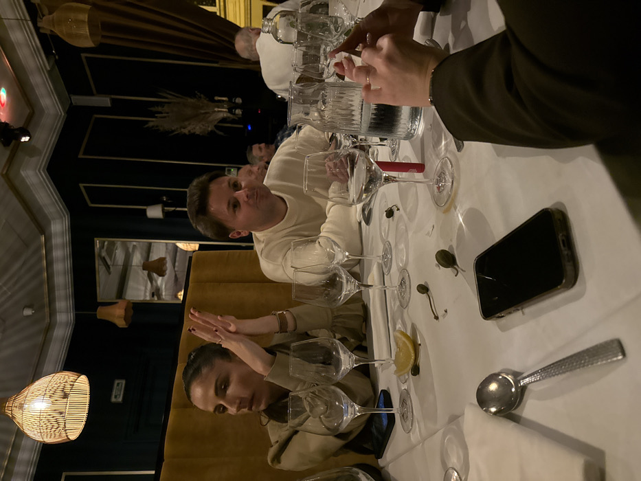 - "At a restaurant, a man and woman sit at a white tablecloth-covered table with multiple wine glasses" by FM-CYJaF3, licensed under CC BY 4.0