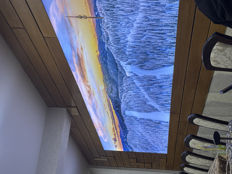 The scene depicts an interior setting, likely a restaurant or communal dining area, situated in or near the city of Smolyan, Bulgaria. A prominent feature is a large, illuminated panoramic display occupying the central portion of a wall paneled with horizontal light brown wooden planks. The display showcases a winter landscape of the Pamporovo ski resort, featuring dense snow-covered coniferous forests, several wide ski slopes, and the distinctive Snezhanka Tower rising from a mountain peak under a sky transitioning from blue to vibrant orange and yellow hues, indicative of sunset or sunrise. In the foreground, a long table, partially visible, is covered with a patterned tablecloth. Several chairs with dark wooden frames and light-patterned upholstered backs and seats are arranged along the table. On the table, a clear glass bottle containing a beverage with a yellow straw is visible, alongside other indistinct dining items. A segment of a person's dark-clad arm and shoulder is visible on the far right, seated at the table. Above the wooden paneling, the wall is plain light grey, with a visible concrete beam.