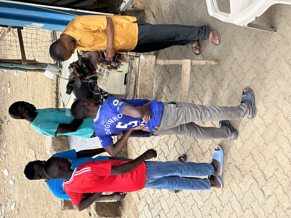 Five men stand outside on a paved surface. One man, wearing a yellow shirt, works on a piece of equipment. Three of the others, in blue, teal, and red shirts, watch him. Another man stands off to the side. The men are wearing trousers or jeans and sandals. A white plastic chair is in the background.