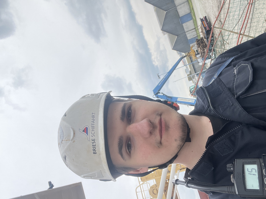 A young adult male, facing the camera with a neutral expression, is depicted in a medium shot against an overcast sky at what is identified as the port of A Coruña, Spain. He wears a soiled white hard hat bearing the "BRIESE SCHIFFFAHRT" logo and text, along with a dark blue zippered work jacket. A black walkie-talkie, displaying the number "15," is clipped to his left chest. To the immediate left in the background, a yellow/orange structure, likely part of a ship or its crane, is visible. To the right, a blue hydraulic crane equipped with an orange grapple attachment is positioned over a green and black flatbed truck loaded with logs. Further in the background, a series of grey industrial buildings with pitched roofs line the horizon. The ground appears to be a paved industrial surface.