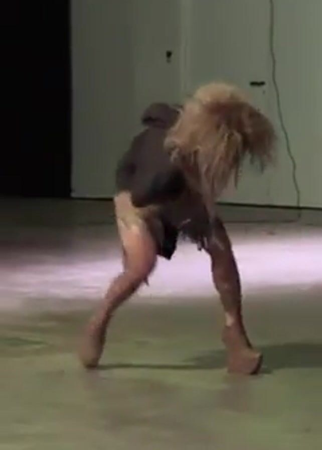 person dressed in an outfit that could be considered as having a post-apocalyptic or dystopian theme, with clothing and accessories that appear worn and disheveled. They are wearing high-heeled platform shoes and knee pads and what appear to be tattered or mud-caked stockings or leggings. Their hair is blonde and disheveled. The person is kneeling and standing up on a smooth, concrete floor in what appears to be a large, sparsely furnished room with white walls. There is a black column or wall in the background to the left and a white door and some electrical cords on the right. They are moving their head down, seemingly in a trance-like or distressed state.