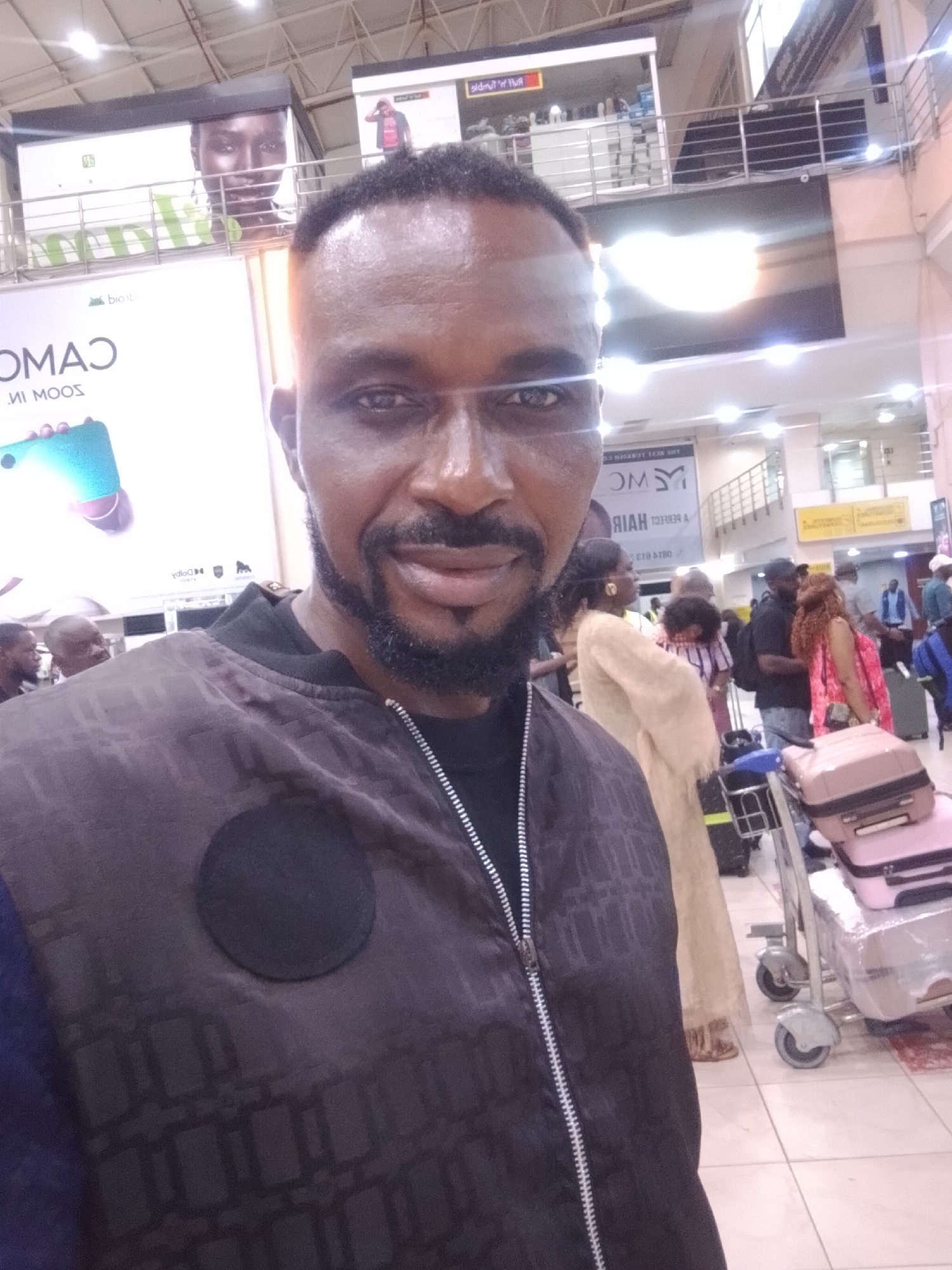 The image depicts an indoor scene within Murtala Muhammed International Airport, Ikeja, Lagos, Nigeria. A Black adult male occupies the foreground, positioned centrally and to the left, taking a selfie. He has dark skin, a short haircut, and a full beard and mustache, looking directly at the camera with a slight smile. He is wearing a dark, possibly charcoal, zippered bomber jacket with a faint repeating pattern and a solid dark circular patch on the left chest, over a dark undershirt. In the mid-ground and background, multiple individuals are present, consistent with airport passengers. To the right of the primary subject, a woman in a long, light-colored garment stands near another woman with reddish-brown curly hair and a patterned top, who is beside a man in a dark cap. Luggage is prominent; two metal baggage carts are visible, one carrying two stacked light pink suitcases and another with white, shrink-wrapped luggage. The environment features high ceilings with exposed structural elements and numerous recessed light fixtures. Large, illuminated advertisement screens are mounted on walls and overhead, displaying images such as a Black woman's face and a hand holding a light blue smartphone (with reversed text including "CAMO"). A metallic-railed upper level or balcony is visible in the background. The floor is tiled with light-colored squares.