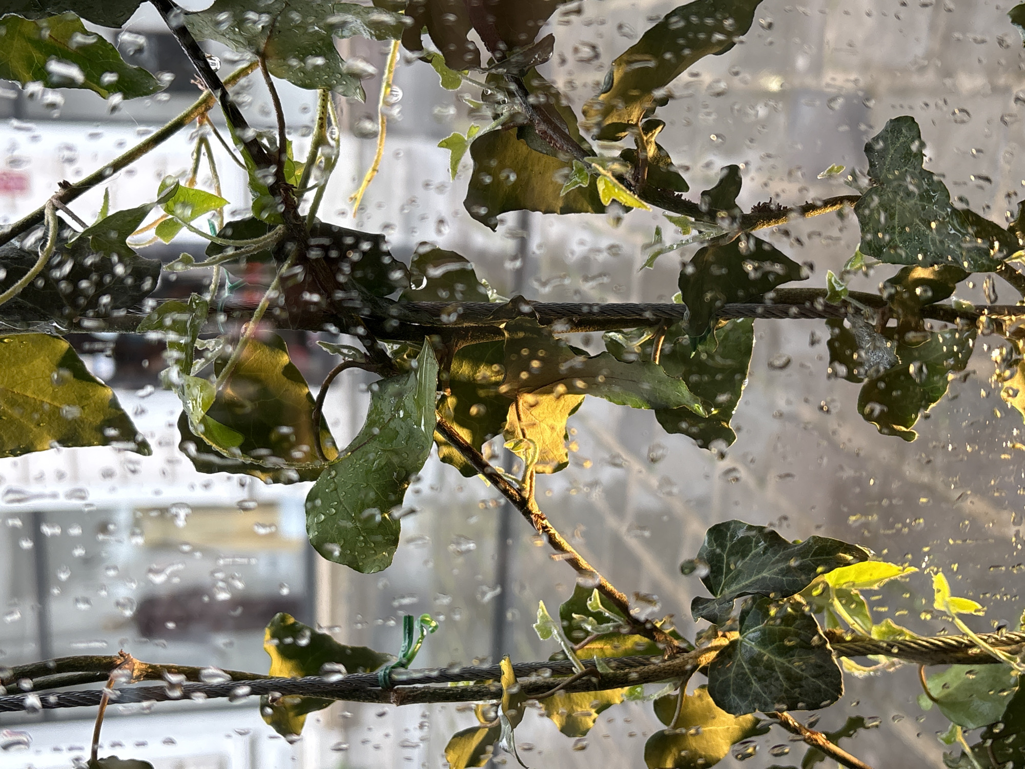 - "A vertical close-up photograph captures an ivy-like plant, characterized by its green, lobed leaves, viewed through a rain-splashed glass surface" by FM-sZqdx1, licensed under CC BY 4.0
