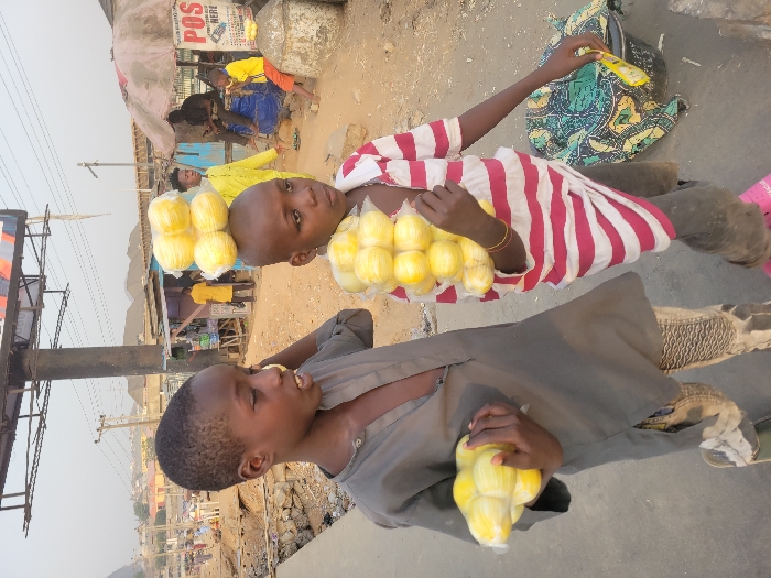 Two young boys sell fruit wrapped in plastic bags. One boy, wearing a gray shirt, eats the fruit. The other boy, in a red and white striped shirt, holds a bag of fruit and what appears to be money or a cell phone. They stand on a concrete surface with a busy background of people, buildings, and a billboard. The sky is overcast.