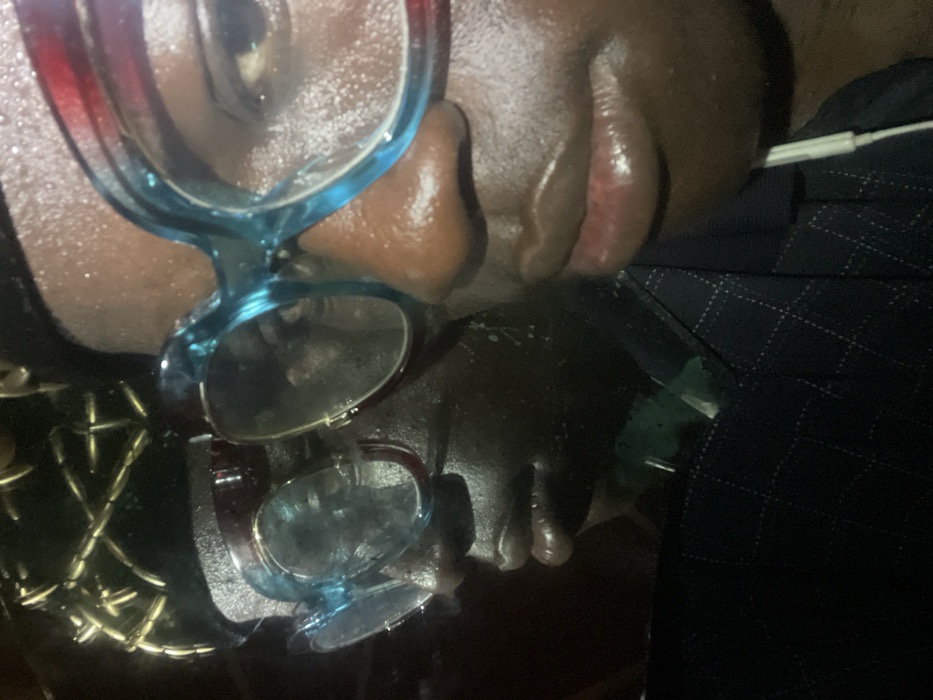 A close-up image depicts an adult individual with a dark complexion, centered in a low-light environment in Mosafejaw, Nigeria. The subject's face appears moist or shiny. They are wearing oversized eyeglasses with thick, two-toned frames: light blue on the upper portion and reddish-brown on the lower. A dark head covering, possibly a cap, is visible, adorned with numerous thin, gold-colored, cylindrical elements arranged in a geometric, crisscross pattern. The individual wears a dark collared garment, likely a shirt or jacket, featuring a subtle grid pattern. A white wired earbud is visible near the lower right side of the frame, close to the subject's neck. A clear reflection of the subject is visible to the left, creating a dual image effect. The background is dark and indistinct.