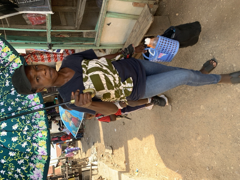The scene depicts an unpaved dirt path in Adankolo, Nigeria, under direct sunlight