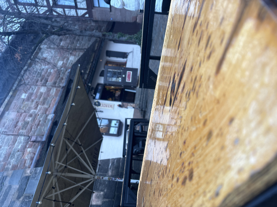 The image depicts an outdoor scene at the "WANDERER" restaurant located on Weißgerbergasse 19 in Nuremberg, Germany. The foreground features a wet, varnished light-brown wooden tabletop, reflecting the ambient light and distant structures. In the midground, black metal outdoor tables and chairs are visible beneath a large, light-colored patio umbrella equipped with string lights, displaying partially visible text like "DERER". Behind this seating area stands a white building with dark window shutters and an open dark wooden door. A vertical sign affixed to the building reads "WANDERER." One individual in light-colored clothing is partially visible near the restaurant doorway, while another person wearing a white, puffy coat is seen from behind on the far right. The background is composed of a prominent multi-story building constructed from reddish-brown stone blocks, a bare deciduous tree, and a partial view of a timber-framed building on the right. The wet surfaces and bare tree suggest recent precipitation and a cold season.
