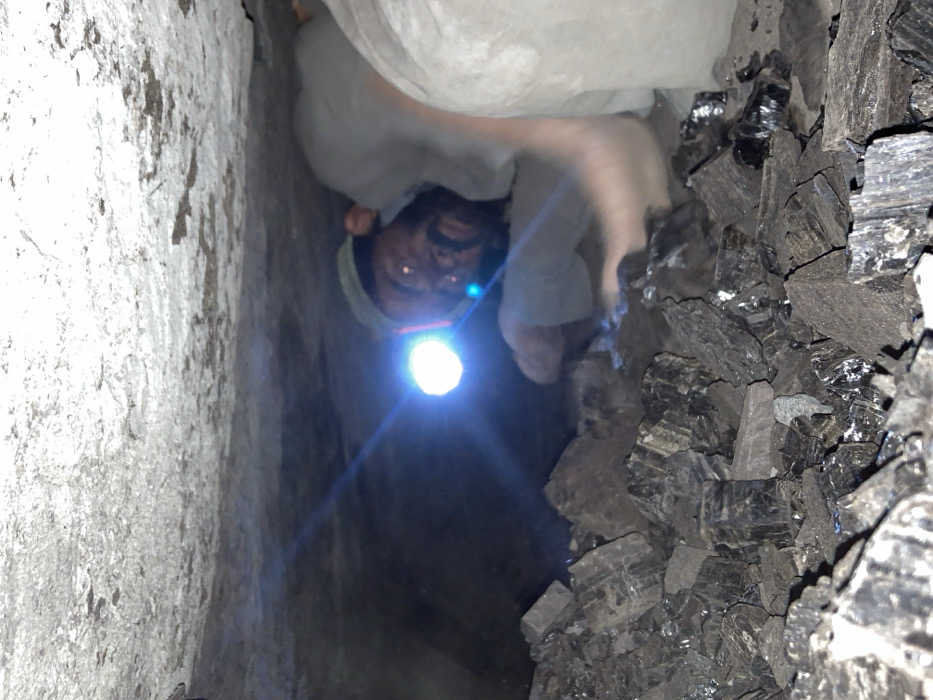A person with a headlamp is wedged in a narrow passage. The passage is lined with rough, light-colored rock on the left and a pile of jagged, dark, reflective material on the right, possibly coal or a similar mineral. The person appears to be looking directly at the camera, with the bright headlamp casting a strong light. The tight confines suggest the person is in a mine, cave, or tunnel.