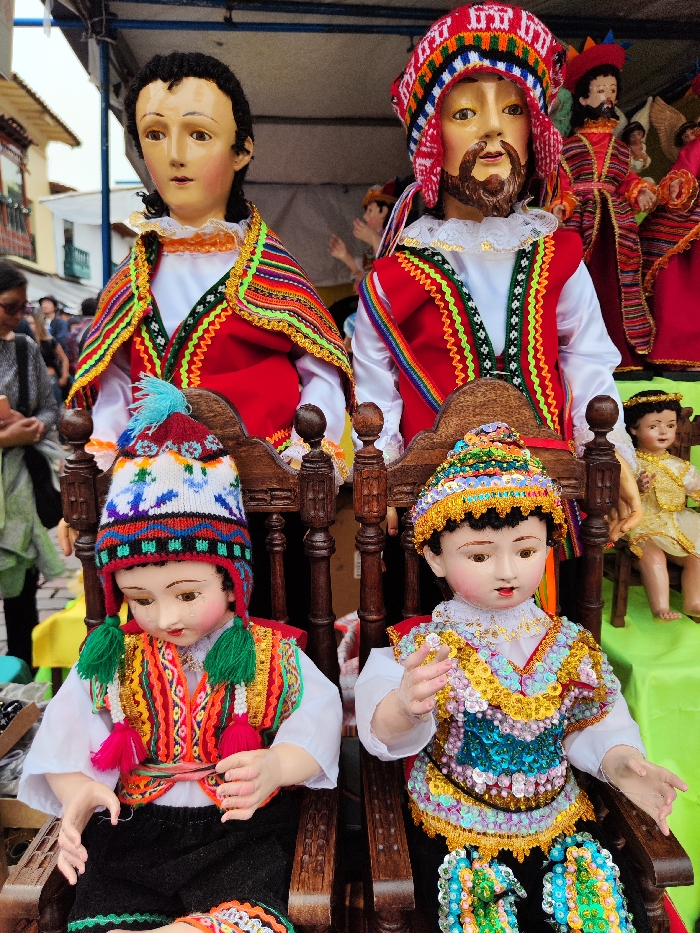 Four dolls dressed in traditional Andean clothing sit in chairs
