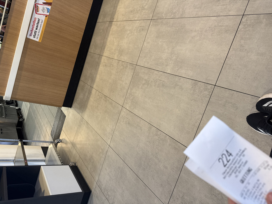 The scene depicts an interior view of a McDonald's restaurant in Hanover, Germany, from the perspective of a person standing on a light grey tiled floor. In the foreground, the lower portion of a person's legs and feet are visible, wearing black athletic shoes with white soles and white stripes. A hand holds two white paper receipts in the lower-left corner; the top receipt displays the number "224" and the German word "QUITTUNG" (receipt). To the right, a wood-paneled counter with a white top trim and black base is visible, featuring a red and white sign that reads "Vorbestellen statt warten! Mit der McDonald's App!" (Order ahead instead of waiting! With the McDonald's App!). To the left, a dark-colored shelving unit with a white base and light top surface is present, with a stainless steel rolling cart directly behind it. Further into the background, an industrial kitchen area with stainless steel equipment and a dark grey floor mat is partially visible, indicating a service or preparation zone.