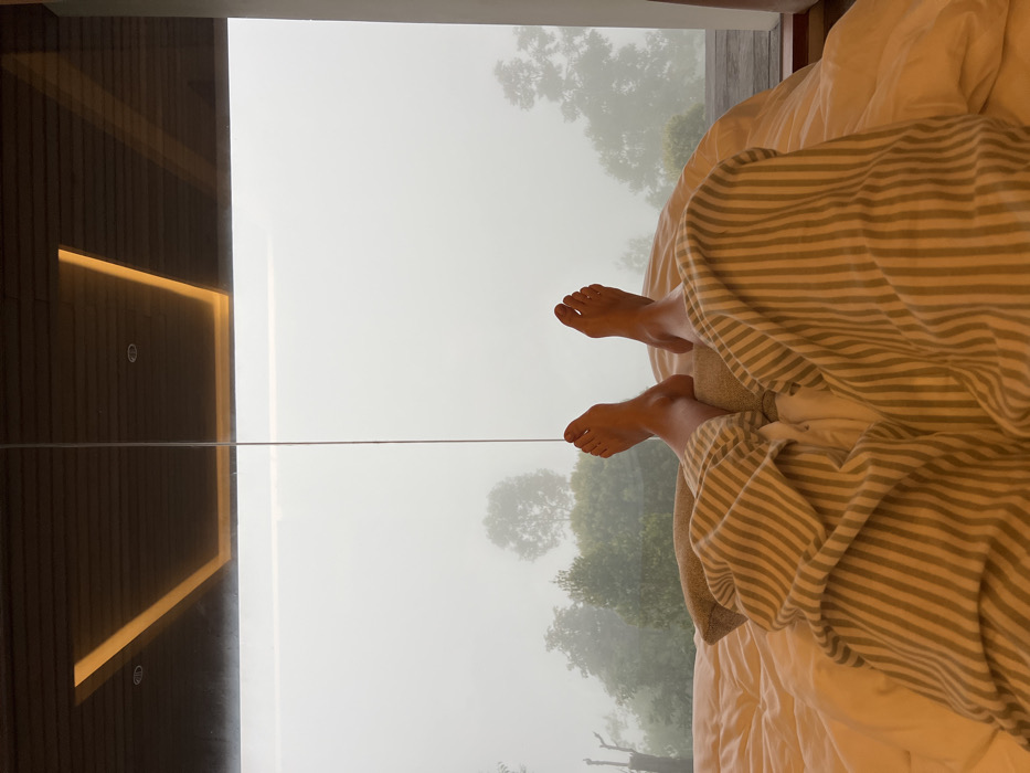 The image depicts an indoor scene in Unknown, Indonesia, from a low-angle perspective. The lower legs and bare feet of an individual are visible, propped on a light-colored pillow on a bed covered with a white duvet. The individual wears light-colored trousers with vertical white stripes. A large, clear glass window occupies the upper two-thirds of the frame, providing a view of an outdoor environment. The window features a thin, vertical metallic support near the center. Outside, dense fog or mist obscures visibility, with the silhouettes of green trees visible in the immediate foreground and mid-ground. A segment of a wooden deck is discernible through the window on the lower right. The reflection on the top of the window shows a dark wooden ceiling with two illuminated rectangular light fixtures emitting a warm glow, and two smaller circular lights.