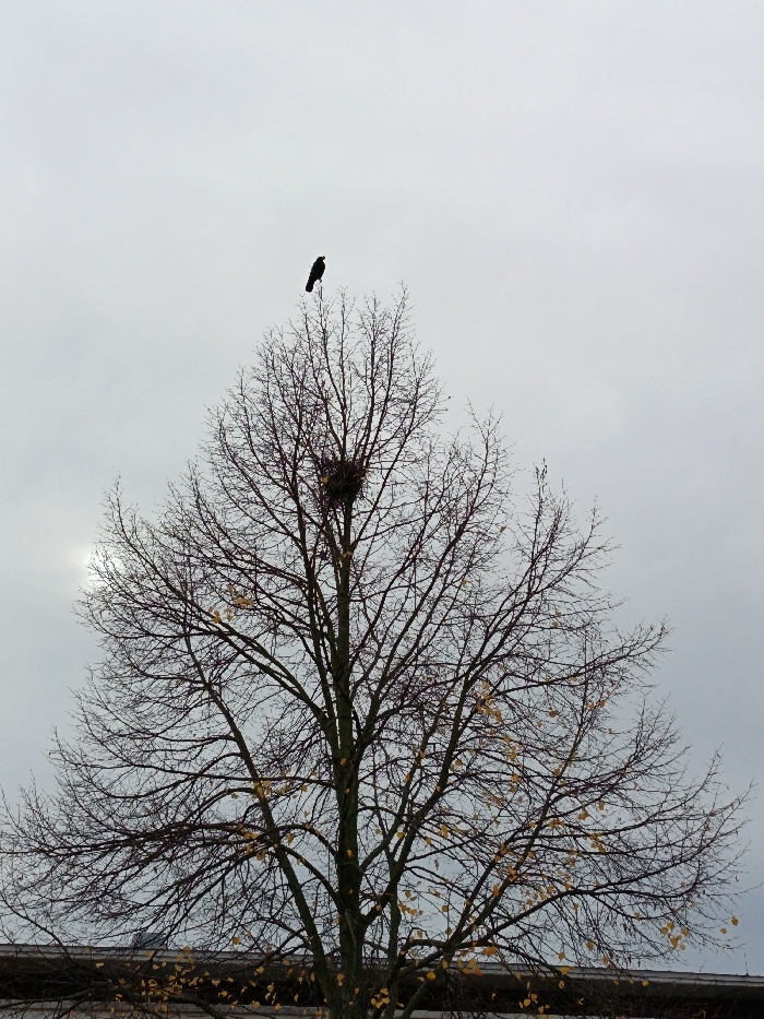 The image displays a tall, deciduous tree, predominantly bare of leaves, against an overcast light grey sky. A single, dark-colored bird is perched prominently at the very top of the tree's uppermost branches, silhouetted against the sky. Approximately two-thirds of the way up the tree, slightly to the left of the main trunk, a large bird's nest constructed from twigs is visible within a cluster of branches. Scattered small, yellow-golden leaves cling to some of the lower and mid-level branches. A faint, brighter light source is present in the upper-left portion of the sky, partially obscured by clouds. Along the very bottom edge of the frame, a dark, horizontal structure, possibly a roofline or upper portion of a building, is partially discernible beneath the tree's lower branches. The scene provides no specific visual markers to identify a precise location within Leipzig, Germany.