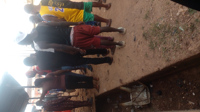 A group of individuals stands on a dirt surface. One person wears a yellow and green basketball jersey. Another wears red shorts and white shoes. A woman in a patterned dress stands apart. A small drainage ditch is visible along the edge of the dirt surface. The area appears to be an outdoor gathering.