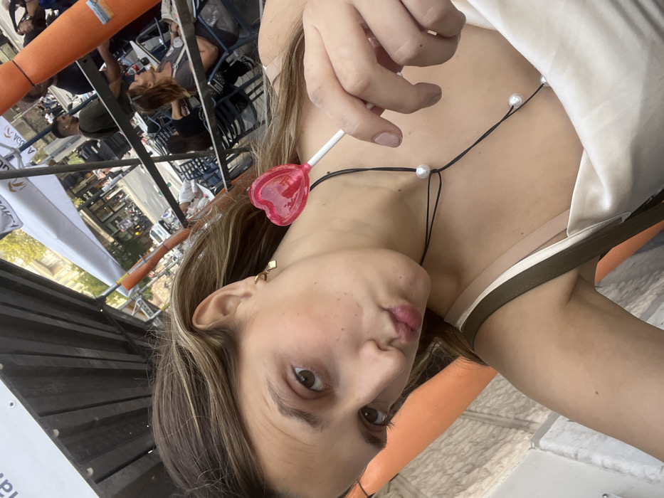 A young adult female is depicted in a close-up, upward-angled selfie, occupying the majority of the frame. Her light brown, wavy hair extends over her right shoulder. She wears a light, possibly satin, strapless garment and a black string necklace adorned with multiple irregularly shaped white pearls. A small, square, gold-toned earring is visible in her right ear. Her lips are pursed. Her right hand, with light-painted fingernails, holds a transparent red heart-shaped lollipop on a white stick, positioned against her upper chest. The background reveals an active outdoor cafe terrace situated on a city street in València, Spain, consistent with establishments found on Carrer de Colón, 25. Orange safety padding covers vertical structural elements in the immediate background. Above, a wooden slatted awning or ceiling is partially visible. Beyond this, multiple patrons are seated at dark tables with chairs, positioned under white umbrellas bearing the word "CAFETERÍA." A woman with brown hair, wearing a dark top, is seated facing right in the mid-ground. Further in the background, a street with parked motorcycles, vehicles, and multi-story buildings featuring balconies can be observed. The scene is illuminated by natural daylight.