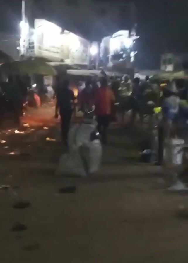 n outdoor night scene. There are many people milling around in a public area. There is a building visible in the background. There are many small lights in the distance. Some of the people appear to be standing around a source of firelight. A white garbage bag sits in the foreground. The video is blurry.