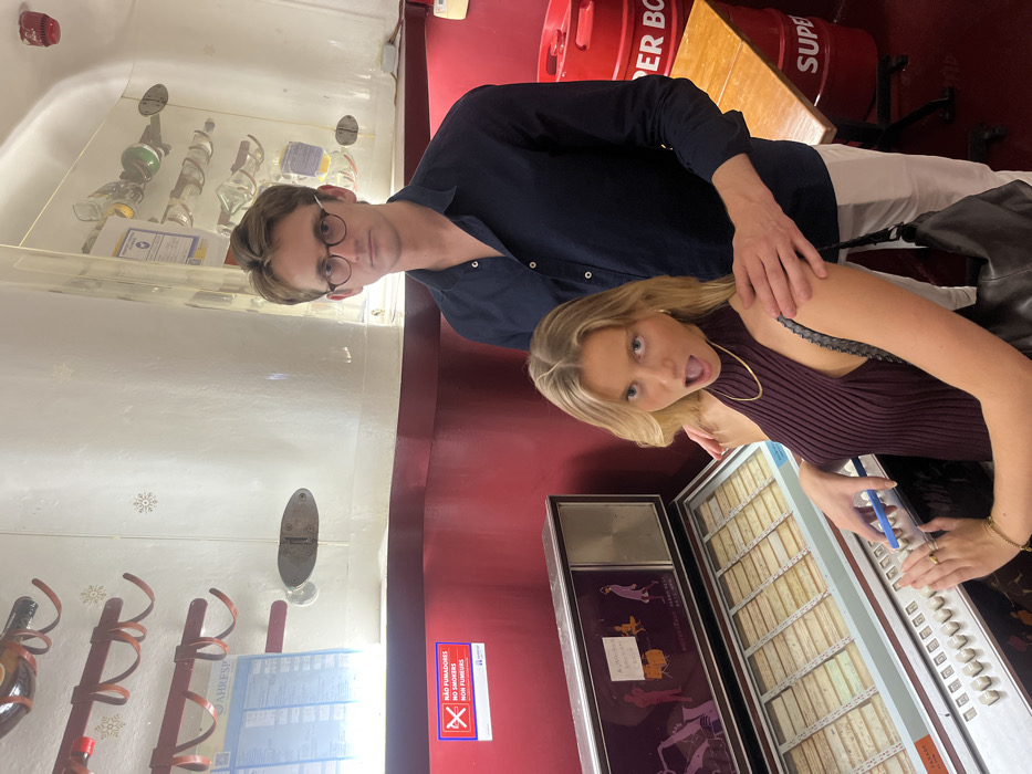 The image depicts two individuals inside the Restaurante Professor Delphim Mendes, located at Rua da Misericórdia, 150-152, in Lisbon, Portugal. A blonde woman, wearing a dark reddish-brown ribbed halter top and a gold chain, is positioned in front of a vintage jukebox, holding a blue stylus-like object with her right hand, her mouth open in an exaggerated expression. A black shoulder bag is visible on her left side. Behind her stands a man with light brown hair and glasses, dressed in a dark blue button-down shirt and light-colored trousers, his left hand resting on her right shoulder. He maintains a neutral facial expression. The interior features a red lower wall panel and a white upper wall with subtle snowflake decals. To the left, a "NÃO FUMADORES" (No Smokers) sign is visible, along with a partially obscured "AHRESP" sign and red wall-mounted fixtures. To the right, a wooden table is accompanied by two red "SUPER BOCK" barrels, which function as seating or decorative elements. A display case containing various items is present on the upper right wall. The vintage jukebox features a display with stylized figures and the text "PROFESSOR DELPHIM MENDES."