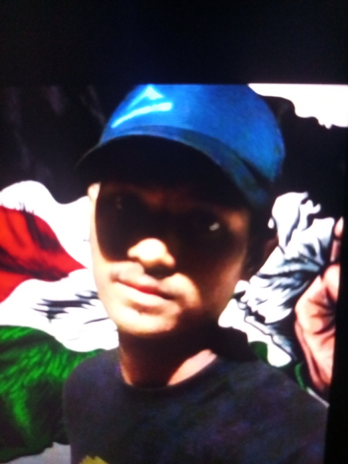 The image displays a head-and-shoulders portrait of an individual, likely male, positioned centrally within the frame. The subject wears a royal blue baseball cap with a prominent light blue or white triangular emblem on the front panel and a dark-colored, possibly black or navy blue, crew-neck t-shirt. Strong directional lighting casts a significant shadow across the upper portion of the subject's face, obscuring the eyes and upper nose, while the lower face, including the mouth and chin, is illuminated, revealing a neutral or slightly smirking expression. The background behind the subject's left shoulder (viewer's left) features a vibrant red, white, and green pattern, consistent with a stylized flag or mural. The pattern includes distinct color bands and wavy elements. Behind the subject's right shoulder (viewer's right), a light-colored, possibly white or grey, abstract design with organic or stylized forms is visible, along with a partial human hand near the right edge, appearing to interact with or be part of this background element. The background elements suggest an indoor setting or a sheltered outdoor location with a painted backdrop or large banner. The specific city of Lhokseumawe, Indonesia, cannot be determined from the visual information present in the image.